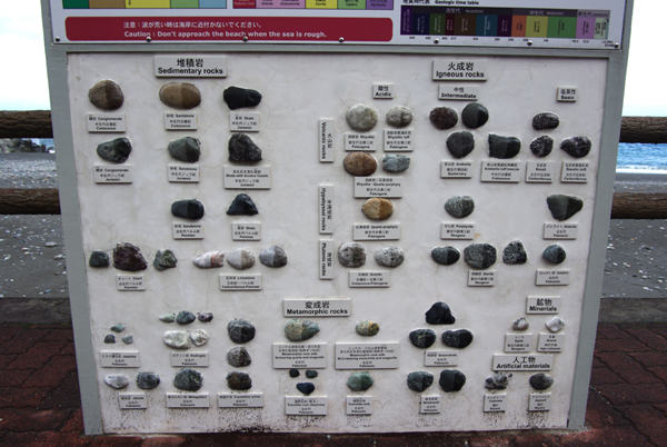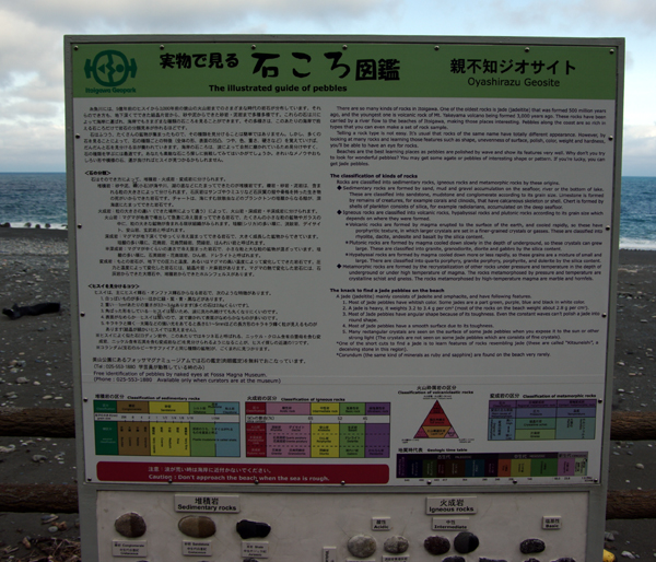なんとこの看板,実物の石がはめ込んであり,海岸で翡翠探しをするときの大きな味方になってくれます.