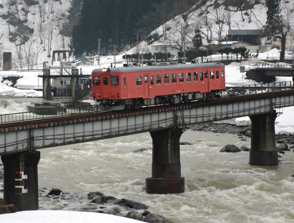 実は,姫川渓谷ジオサイトを走る大糸線では,どことなく郷愁を誘い多くの人から愛された勾配区間用2エンジン気動車のキハ52が現役で運転しています.しかし,経年から来る老朽化のため平成22年3月13日を最後に引退することになってしまいました.というわけで,その勇姿を目に焼き付けるぞ!ついでに写真も撮るぞ!と勇んで南下.数名の鉄道ファンとともに待っていると・・・来ました!姫川渓谷にかかる橋を渡るキハ52.